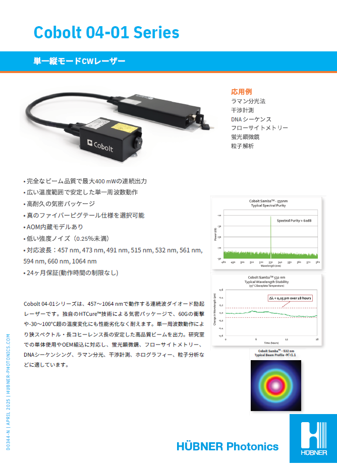 単一縦モードで動作し、線幅は1MHz未満と極めて狭いため、ラマン分光やホログラフィ用途にも非常に適しています。