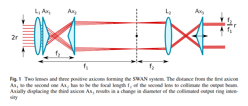 そこで、本研究では、3つのアキシコンと2つのレンズを用いた新しい光学システム(SWANシステム)を提案した。このシステムは、コリメートされたアニュラーリング強度パターンを生成し、リングの直径を調整可能とする。