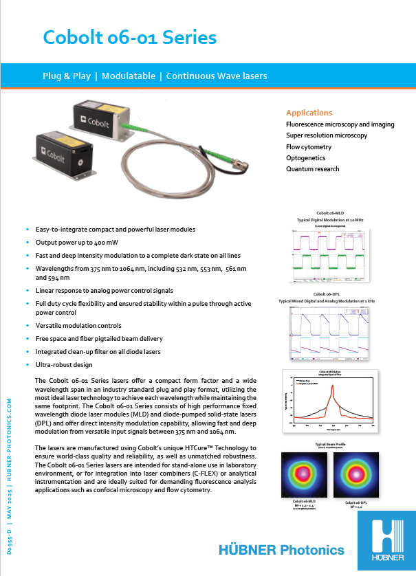 Coboltの638nmレーザーは、高度なビーム整形技術により、非常に優れたビーム品質を実現しています。さらに、半導体レーザーならではの特性を活かし、最大で150MHzの高速強度変調に対応可能です。ファイバーピグテイルオプションもご提供できます。