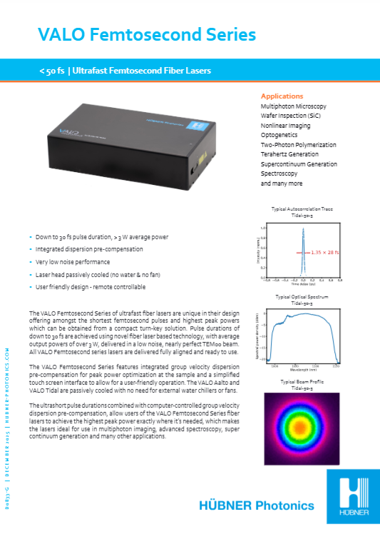 HÜBNER Photonics社のフェムト秒レーザーVALO は、非常に短いパルスかつ高いピークパワーを誇る、コンパクトなターンキー型(即使用可能)のファイバーレーザーです。主な技術的特徴圧倒的な短パルスと高出力: 独自のファイバー技術により、最短 30 fs のパルス幅と 3 W を超える平均出力を実現しています。