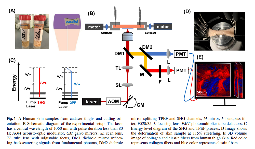 そこで、本研究では、24のヒト皮膚サンプルに対して、HÜBNER Photonics社製>50fs フェムト秒レーザーVALO Tidalを用いた二光子励起自家蛍光および第二高調波発生顕微鏡によりコラーゲンおよびエラスチン繊維を3次元的に観察した。また、一軸伸張実験を実施し、得られた応力-ひずみ曲線から、初期ヤング率、弾性ヤング率、最大応力、最大ひずみなどの力学特性を導出した。その結果、年齢がヤング率およびコラーゲン密度に負の相関を持つことが明らかになった。さらに、実時間モニタリングにより、エラスチン繊維は初期および線形領域で有意に配向し、コラーゲン束は主に線形領域で配向することが観察された。これにより、皮膚の力学特性に関する理解が深まり、将来的な皮膚組織の完全モデリングに向けた基礎的なデータが提供された。