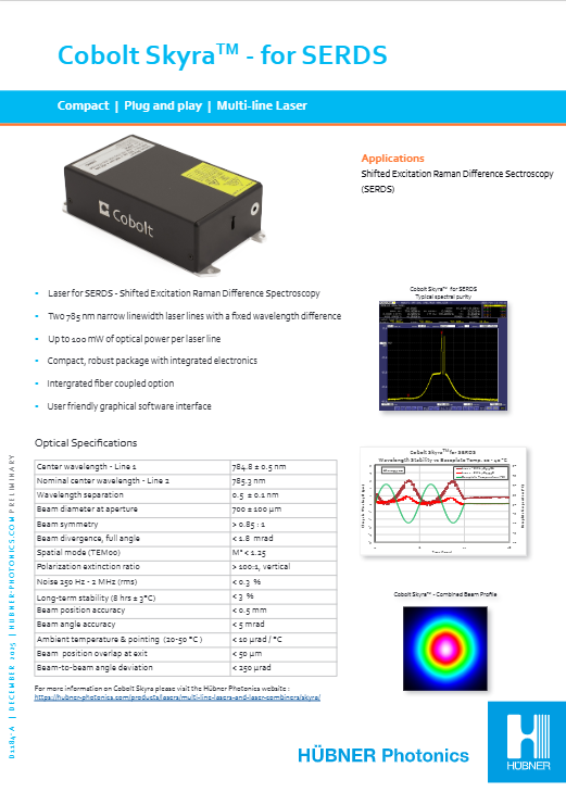 SERDS(シフト励起ラマン差分分光法)専用に設計された小型な2波長同時発振レーザーです。固定波長差を持つ2本の785 nmの狭帯域レーザーを1台に統合しております。